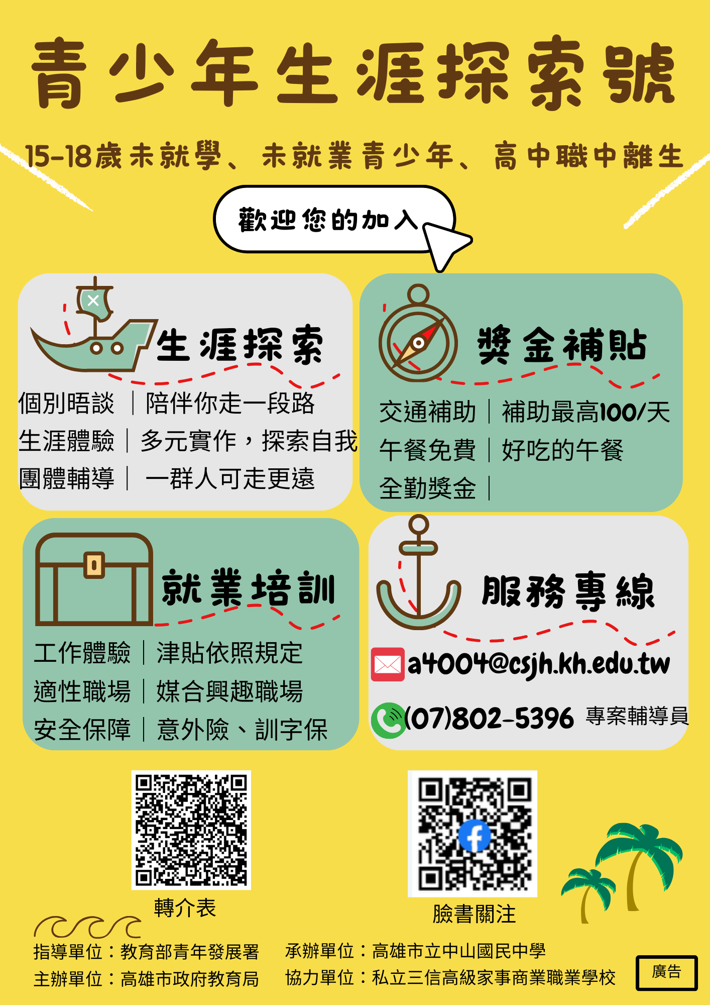 主旨:為辦理本市「114 年度青少年生涯探索號計畫」,倘經評估有服務需求個案,請轉介參與114年第3期課程。