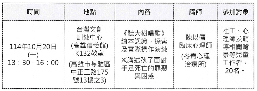 主旨:檢送辦理114年「創傷繪本x心理照顧-培養孩子的復原力」繪本推廣工作坊單張1份。